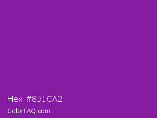 Hex #851ca2 Color is a normal purple color and the nearest color is Violet Eggplant #991199. Hex code #851ca2 and RGB value is rgb(133,28,162). In RGB color space, this color is composed of 52% red, 11% green, 64% blue, In CMYK color space, this color is composed of 18% cyan, 83% magenta, 0% yellow , 36% black , In HSL color space, this color has a hue angle of 287° , 71% saturation and 37% lightness.