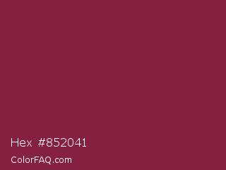 Hex #852041 Color is a normal rose color and the nearest color is Claret #7f1734. Hex code #852041 and RGB value is rgb(133,32,65). In RGB color space, this color is composed of 52% red, 13% green, 25% blue, In CMYK color space, this color is composed of 0% cyan, 76% magenta, 51% yellow , 48% black , In HSL color space, this color has a hue angle of 340° , 61% saturation and 32% lightness.