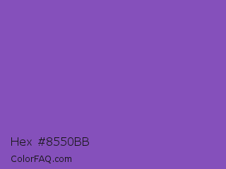 Hex #8550bb Color is a normal violet color and the nearest color is Fuchsia Blue #7a58c1. Hex code #8550bb and RGB value is rgb(133,80,187). In RGB color space, this color is composed of 52% red, 31% green, 73% blue, In CMYK color space, this color is composed of 29% cyan, 57% magenta, 0% yellow , 27% black , In HSL color space, this color has a hue angle of 270° , 44% saturation and 52% lightness.