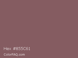 Hex #855c61 Color is a normal red color and the nearest color is Deep Taupe #7e5e60. Hex code #855c61 and RGB value is rgb(133,92,97). In RGB color space, this color is composed of 52% red, 36% green, 38% blue, In CMYK color space, this color is composed of 0% cyan, 31% magenta, 27% yellow , 48% black , In HSL color space, this color has a hue angle of 353° , 18% saturation and 44% lightness.