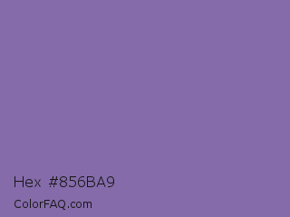 Hex #856ba9 Color is a normal violet color and the nearest color is Deluge #7563a8. Hex code #856ba9 and RGB value is rgb(133,107,169). In RGB color space, this color is composed of 52% red, 42% green, 66% blue, In CMYK color space, this color is composed of 21% cyan, 37% magenta, 0% yellow , 34% black , In HSL color space, this color has a hue angle of 265° , 26% saturation and 54% lightness.