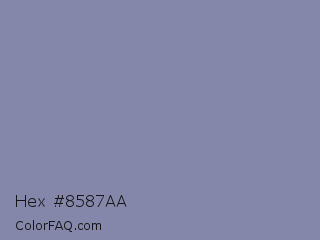 Hex #8587aa Color is a normal blue color and the nearest color is Cool Grey #8c92ac. Hex code #8587aa and RGB value is rgb(133,135,170). In RGB color space, this color is composed of 52% red, 53% green, 67% blue, In CMYK color space, this color is composed of 22% cyan, 21% magenta, 0% yellow , 33% black , In HSL color space, this color has a hue angle of 237° , 18% saturation and 59% lightness.