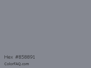 Hex #858891 Color is a normal blue color and the nearest color is Oslo Gray #878d91. Hex code #858891 and RGB value is rgb(133,136,145). In RGB color space, this color is composed of 52% red, 53% green, 57% blue, In CMYK color space, this color is composed of 8% cyan, 6% magenta, 0% yellow , 43% black , In HSL color space, this color has a hue angle of 225° , 5% saturation and 55% lightness.