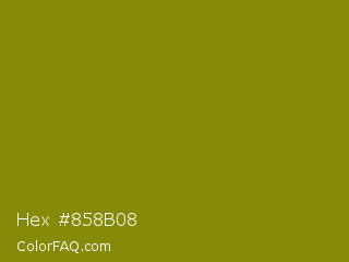 Hex #858b08 Color is a dark yellow color and the nearest color is Olive #808000. Hex code #858b08 and RGB value is rgb(133,139,8). In RGB color space, this color is composed of 52% red, 55% green, 3% blue, In CMYK color space, this color is composed of 4% cyan, 0% magenta, 94% yellow , 45% black , In HSL color space, this color has a hue angle of 63° , 89% saturation and 29% lightness.