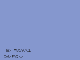 Hex #8597ce Color is a light blue color and the nearest color is Vista Blue #7c9ed9. Hex code #8597ce and RGB value is rgb(133,151,206). In RGB color space, this color is composed of 52% red, 59% green, 81% blue, In CMYK color space, this color is composed of 35% cyan, 27% magenta, 0% yellow , 19% black , In HSL color space, this color has a hue angle of 225° , 43% saturation and 66% lightness.