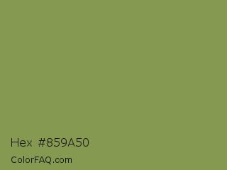Hex #859a50 Color is a normal lime color and the nearest color is Moss Green #8a9a5b. Hex code #859a50 and RGB value is rgb(133,154,80). In RGB color space, this color is composed of 52% red, 60% green, 31% blue, In CMYK color space, this color is composed of 14% cyan, 0% magenta, 48% yellow , 40% black , In HSL color space, this color has a hue angle of 77° , 32% saturation and 46% lightness.