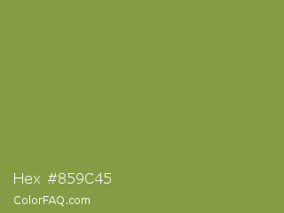 Hex #859c45 Color is a normal lime color and the nearest color is Sushi #87ab39. Hex code #859c45 and RGB value is rgb(133,156,69). In RGB color space, this color is composed of 52% red, 61% green, 27% blue, In CMYK color space, this color is composed of 15% cyan, 0% magenta, 56% yellow , 39% black , In HSL color space, this color has a hue angle of 76° , 39% saturation and 44% lightness.