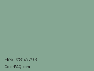 Hex #85a793 Color is a normal green color and the nearest color is Envy #8ba690. Hex code #85a793 and RGB value is rgb(133,167,147). In RGB color space, this color is composed of 52% red, 65% green, 58% blue, In CMYK color space, this color is composed of 20% cyan, 0% magenta, 12% yellow , 35% black , In HSL color space, this color has a hue angle of 145° , 16% saturation and 59% lightness.