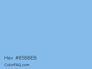 Hex #85bbeb Color is a light blue color and the nearest color is Jordy Blue #8ab9f1. Hex code #85bbeb and RGB value is rgb(133,187,235). In RGB color space, this color is composed of 52% red, 73% green, 92% blue, In CMYK color space, this color is composed of 43% cyan, 20% magenta, 0% yellow , 8% black , In HSL color space, this color has a hue angle of 208° , 72% saturation and 72% lightness.