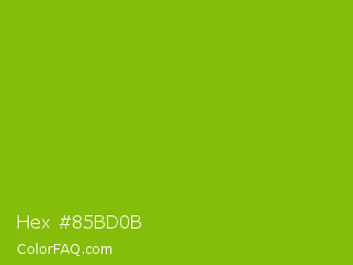 Hex #85bd0b Color is a normal lime color and the nearest color is Apple Green #8db600. Hex code #85bd0b and RGB value is rgb(133,189,11). In RGB color space, this color is composed of 52% red, 74% green, 4% blue, In CMYK color space, this color is composed of 30% cyan, 0% magenta, 94% yellow , 26% black , In HSL color space, this color has a hue angle of 79° , 89% saturation and 39% lightness.