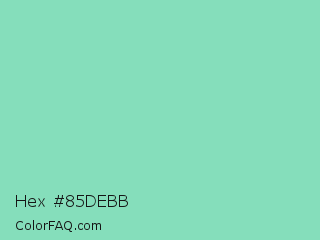 Hex #85debb Color is a light green color and the nearest color is Pearl Aqua #88d8c0. Hex code #85debb and RGB value is rgb(133,222,187). In RGB color space, this color is composed of 52% red, 87% green, 73% blue, In CMYK color space, this color is composed of 40% cyan, 0% magenta, 16% yellow , 13% black , In HSL color space, this color has a hue angle of 156° , 57% saturation and 70% lightness.