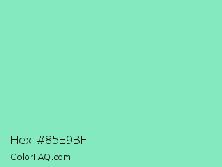 Hex #85e9bf Color is a light green color and the nearest color is Pearl Aqua #88d8c0. Hex code #85e9bf and RGB value is rgb(133,233,191). In RGB color space, this color is composed of 52% red, 91% green, 75% blue, In CMYK color space, this color is composed of 43% cyan, 0% magenta, 18% yellow , 9% black , In HSL color space, this color has a hue angle of 155° , 69% saturation and 72% lightness.