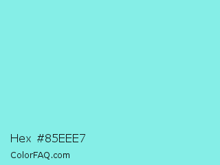 Hex #85eee7 Color is a light cyan color and the nearest color is Riptide #8be6d8. Hex code #85eee7 and RGB value is rgb(133,238,231). In RGB color space, this color is composed of 52% red, 93% green, 91% blue, In CMYK color space, this color is composed of 44% cyan, 0% magenta, 3% yellow , 7% black , In HSL color space, this color has a hue angle of 176° , 76% saturation and 73% lightness.