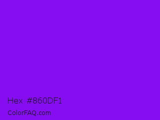 Hex #860df1 Color is a normal purple color and the nearest color is Electric Violet #8b00ff. Hex code #860df1 and RGB value is rgb(134,13,241). In RGB color space, this color is composed of 53% red, 5% green, 95% blue, In CMYK color space, this color is composed of 44% cyan, 95% magenta, 0% yellow , 5% black , In HSL color space, this color has a hue angle of 272° , 90% saturation and 50% lightness.