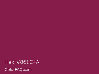 Hex #861c4a Color is a normal rose color and the nearest color is Disco #871550. Hex code #861c4a and RGB value is rgb(134,28,74). In RGB color space, this color is composed of 53% red, 11% green, 29% blue, In CMYK color space, this color is composed of 0% cyan, 79% magenta, 45% yellow , 47% black , In HSL color space, this color has a hue angle of 334° , 65% saturation and 32% lightness.