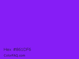 Hex #861df6 Color is a normal violet color and the nearest color is Blue Violet #8a2be2. Hex code #861df6 and RGB value is rgb(134,29,246). In RGB color space, this color is composed of 53% red, 11% green, 96% blue, In CMYK color space, this color is composed of 46% cyan, 88% magenta, 0% yellow , 4% black , In HSL color space, this color has a hue angle of 269° , 92% saturation and 54% lightness.
