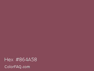 Hex #864a58 Color is a normal red color and the nearest color is Deep Ruby #843f5b. Hex code #864a58 and RGB value is rgb(134,74,88). In RGB color space, this color is composed of 53% red, 29% green, 35% blue, In CMYK color space, this color is composed of 0% cyan, 45% magenta, 34% yellow , 47% black , In HSL color space, this color has a hue angle of 346° , 29% saturation and 41% lightness.