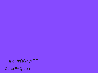 Hex #864aff Color is a light indigo color and the nearest color is Navy Purple #9457eb. Hex code #864aff and RGB value is rgb(134,74,255). In RGB color space, this color is composed of 53% red, 29% green, 100% blue, In CMYK color space, this color is composed of 47% cyan, 71% magenta, 0% yellow , 0% black , In HSL color space, this color has a hue angle of 260° , 100% saturation and 65% lightness.