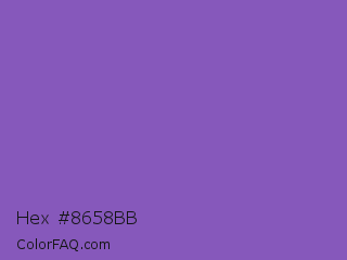 Hex #8658bb Color is a normal violet color and the nearest color is Fuchsia Blue #7a58c1. Hex code #8658bb and RGB value is rgb(134,88,187). In RGB color space, this color is composed of 53% red, 35% green, 73% blue, In CMYK color space, this color is composed of 28% cyan, 53% magenta, 0% yellow , 27% black , In HSL color space, this color has a hue angle of 268° , 42% saturation and 54% lightness.
