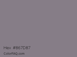 Hex #867d87 Color is a normal magenta color and the nearest color is Suva Gray #888387. Hex code #867d87 and RGB value is rgb(134,125,135). In RGB color space, this color is composed of 53% red, 49% green, 53% blue, In CMYK color space, this color is composed of 1% cyan, 7% magenta, 0% yellow , 47% black , In HSL color space, this color has a hue angle of 294° , 4% saturation and 51% lightness.