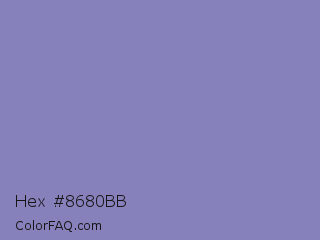 Hex #8680bb Color is a light indigo color and the nearest color is Ube #8878c3. Hex code #8680bb and RGB value is rgb(134,128,187). In RGB color space, this color is composed of 53% red, 50% green, 73% blue, In CMYK color space, this color is composed of 28% cyan, 32% magenta, 0% yellow , 27% black , In HSL color space, this color has a hue angle of 246° , 30% saturation and 62% lightness.