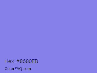 Hex #8680eb Color is a light indigo color and the nearest color is Chetwode Blue #8581d9. Hex code #8680eb and RGB value is rgb(134,128,235). In RGB color space, this color is composed of 53% red, 50% green, 92% blue, In CMYK color space, this color is composed of 43% cyan, 46% magenta, 0% yellow , 8% black , In HSL color space, this color has a hue angle of 243° , 73% saturation and 71% lightness.