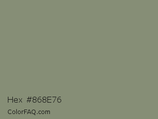 Hex #868e76 Color is a normal green color and the nearest color is Bitter #868974. Hex code #868e76 and RGB value is rgb(134,142,118). In RGB color space, this color is composed of 53% red, 56% green, 46% blue, In CMYK color space, this color is composed of 6% cyan, 0% magenta, 17% yellow , 44% black , In HSL color space, this color has a hue angle of 80° , 10% saturation and 51% lightness.