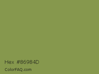 Hex #86984d Color is a normal lime color and the nearest color is Moss Green #8a9a5b. Hex code #86984d and RGB value is rgb(134,152,77). In RGB color space, this color is composed of 53% red, 60% green, 30% blue, In CMYK color space, this color is composed of 12% cyan, 0% magenta, 49% yellow , 40% black , In HSL color space, this color has a hue angle of 74° , 33% saturation and 45% lightness.