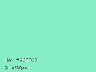 Hex #86efc7 Color is a light green color and the nearest color is Riptide #8be6d8. Hex code #86efc7 and RGB value is rgb(134,239,199). In RGB color space, this color is composed of 53% red, 94% green, 78% blue, In CMYK color space, this color is composed of 44% cyan, 0% magenta, 17% yellow , 6% black , In HSL color space, this color has a hue angle of 157° , 77% saturation and 73% lightness.