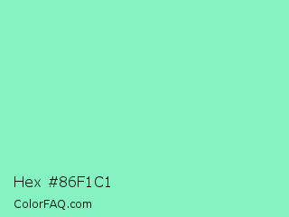 Hex #86f1c1 Color is a light green color and the nearest color is Algae Green #93dfb8. Hex code #86f1c1 and RGB value is rgb(134,241,193). In RGB color space, this color is composed of 53% red, 95% green, 76% blue, In CMYK color space, this color is composed of 44% cyan, 0% magenta, 20% yellow , 5% black , In HSL color space, this color has a hue angle of 153° , 79% saturation and 74% lightness.