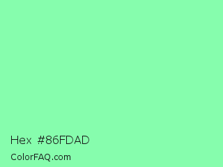 Hex #86fdad Color is a light green color and the nearest color is Pale Green #98fb98. Hex code #86fdad and RGB value is rgb(134,253,173). In RGB color space, this color is composed of 53% red, 99% green, 68% blue, In CMYK color space, this color is composed of 47% cyan, 0% magenta, 32% yellow , 1% black , In HSL color space, this color has a hue angle of 140° , 97% saturation and 76% lightness.