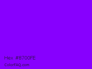 Hex #8700fe Color is a normal purple color and the nearest color is Electric Violet #8b00ff. Hex code #8700fe and RGB value is rgb(135,0,254). In RGB color space, this color is composed of 53% red, 0% green, 100% blue, In CMYK color space, this color is composed of 47% cyan, 100% magenta, 0% yellow , 0% black , In HSL color space, this color has a hue angle of 272° , 100% saturation and 50% lightness.