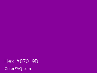 Hex #87019b Color is a normal magenta color and the nearest color is Dark Magenta #8b008b. Hex code #87019b and RGB value is rgb(135,1,155). In RGB color space, this color is composed of 53% red, 0% green, 61% blue, In CMYK color space, this color is composed of 13% cyan, 99% magenta, 0% yellow , 39% black , In HSL color space, this color has a hue angle of 292° , 99% saturation and 31% lightness.