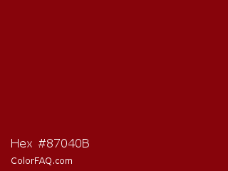 Hex #87040b Color is a dark red color and the nearest color is Red Devil #860111. Hex code #87040b and RGB value is rgb(135,4,11). In RGB color space, this color is composed of 53% red, 2% green, 4% blue, In CMYK color space, this color is composed of 0% cyan, 97% magenta, 92% yellow , 47% black , In HSL color space, this color has a hue angle of 357° , 94% saturation and 27% lightness.