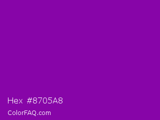 Hex #8705a8 Color is a normal purple color and the nearest color is Violet RYB #8601af. Hex code #8705a8 and RGB value is rgb(135,5,168). In RGB color space, this color is composed of 53% red, 2% green, 66% blue, In CMYK color space, this color is composed of 20% cyan, 97% magenta, 0% yellow , 34% black , In HSL color space, this color has a hue angle of 288° , 94% saturation and 34% lightness.