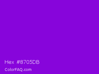 Hex #8705db Color is a normal purple color and the nearest color is French Violet #8806ce. Hex code #8705db and RGB value is rgb(135,5,219). In RGB color space, this color is composed of 53% red, 2% green, 86% blue, In CMYK color space, this color is composed of 38% cyan, 98% magenta, 0% yellow , 14% black , In HSL color space, this color has a hue angle of 276° , 96% saturation and 44% lightness.
