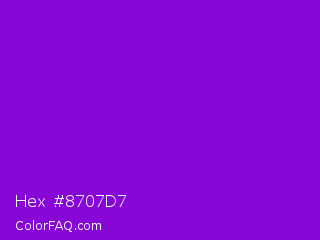 Hex #8707d7 Color is a normal purple color and the nearest color is French Violet #8806ce. Hex code #8707d7 and RGB value is rgb(135,7,215). In RGB color space, this color is composed of 53% red, 3% green, 84% blue, In CMYK color space, this color is composed of 37% cyan, 97% magenta, 0% yellow , 16% black , In HSL color space, this color has a hue angle of 277° , 94% saturation and 44% lightness.