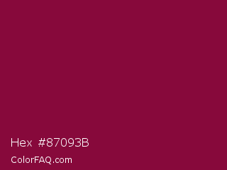 Hex #87093b Color is a dark rose color and the nearest color is Rose Bud Cherry #800b47. Hex code #87093b and RGB value is rgb(135,9,59). In RGB color space, this color is composed of 53% red, 4% green, 23% blue, In CMYK color space, this color is composed of 0% cyan, 93% magenta, 56% yellow , 47% black , In HSL color space, this color has a hue angle of 336° , 88% saturation and 28% lightness.