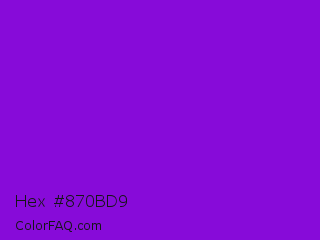 Hex #870bd9 Color is a normal purple color and the nearest color is French Violet #8806ce. Hex code #870bd9 and RGB value is rgb(135,11,217). In RGB color space, this color is composed of 53% red, 4% green, 85% blue, In CMYK color space, this color is composed of 38% cyan, 95% magenta, 0% yellow , 15% black , In HSL color space, this color has a hue angle of 276° , 90% saturation and 45% lightness.