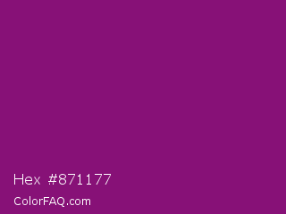 Hex #871177 Color is a dark magenta color and the nearest color is Patriarch #800080. Hex code #871177 and RGB value is rgb(135,17,119). In RGB color space, this color is composed of 53% red, 7% green, 47% blue, In CMYK color space, this color is composed of 0% cyan, 87% magenta, 12% yellow , 47% black , In HSL color space, this color has a hue angle of 308° , 78% saturation and 30% lightness.