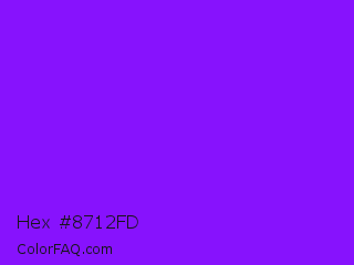 Hex #8712fd Color is a normal violet color and the nearest color is Electric Violet #8b00ff. Hex code #8712fd and RGB value is rgb(135,18,253). In RGB color space, this color is composed of 53% red, 7% green, 99% blue, In CMYK color space, this color is composed of 47% cyan, 93% magenta, 0% yellow , 1% black , In HSL color space, this color has a hue angle of 270° , 98% saturation and 53% lightness.