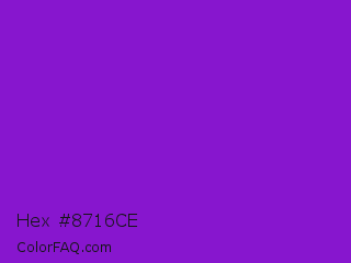 Hex #8716ce Color is a normal purple color and the nearest color is French Violet #8806ce. Hex code #8716ce and RGB value is rgb(135,22,206). In RGB color space, this color is composed of 53% red, 9% green, 81% blue, In CMYK color space, this color is composed of 34% cyan, 89% magenta, 0% yellow , 19% black , In HSL color space, this color has a hue angle of 277° , 81% saturation and 45% lightness.