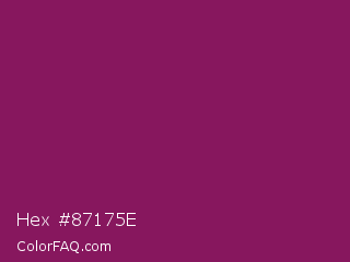 Hex #87175e Color is a normal magenta color and the nearest color is French Plum #811453. Hex code #87175e and RGB value is rgb(135,23,94). In RGB color space, this color is composed of 53% red, 9% green, 37% blue, In CMYK color space, this color is composed of 0% cyan, 83% magenta, 30% yellow , 47% black , In HSL color space, this color has a hue angle of 322° , 71% saturation and 31% lightness.