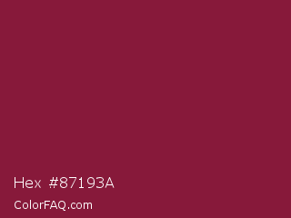 Hex #87193a Color is a normal rose color and the nearest color is Claret #7f1734. Hex code #87193a and RGB value is rgb(135,25,58). In RGB color space, this color is composed of 53% red, 10% green, 23% blue, In CMYK color space, this color is composed of 0% cyan, 81% magenta, 57% yellow , 47% black , In HSL color space, this color has a hue angle of 342° , 69% saturation and 31% lightness.