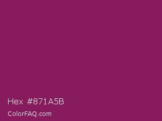 Hex #871a5b Color is a normal magenta color and the nearest color is French Plum #811453. Hex code #871a5b and RGB value is rgb(135,26,91). In RGB color space, this color is composed of 53% red, 10% green, 36% blue, In CMYK color space, this color is composed of 0% cyan, 81% magenta, 33% yellow , 47% black , In HSL color space, this color has a hue angle of 324° , 68% saturation and 32% lightness.