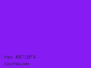 Hex #871bf4 Color is a normal violet color and the nearest color is Blue Violet #8a2be2. Hex code #871bf4 and RGB value is rgb(135,27,244). In RGB color space, this color is composed of 53% red, 11% green, 96% blue, In CMYK color space, this color is composed of 45% cyan, 89% magenta, 0% yellow , 4% black , In HSL color space, this color has a hue angle of 270° , 91% saturation and 53% lightness.