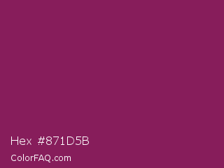 Hex #871d5b Color is a normal magenta color and the nearest color is Dark Raspberry #872657. Hex code #871d5b and RGB value is rgb(135,29,91). In RGB color space, this color is composed of 53% red, 11% green, 36% blue, In CMYK color space, this color is composed of 0% cyan, 79% magenta, 33% yellow , 47% black , In HSL color space, this color has a hue angle of 325° , 65% saturation and 32% lightness.