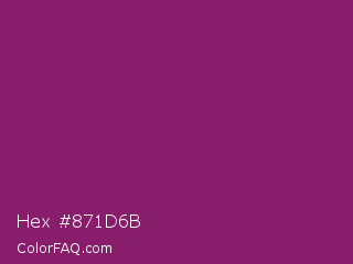 Hex #871d6b Color is a normal magenta color and the nearest color is Dark Raspberry #872657. Hex code #871d6b and RGB value is rgb(135,29,107). In RGB color space, this color is composed of 53% red, 11% green, 42% blue, In CMYK color space, this color is composed of 0% cyan, 79% magenta, 21% yellow , 47% black , In HSL color space, this color has a hue angle of 316° , 65% saturation and 32% lightness.