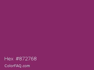 Hex #872768 Color is a normal magenta color and the nearest color is Boysenberry #873260. Hex code #872768 and RGB value is rgb(135,39,104). In RGB color space, this color is composed of 53% red, 15% green, 41% blue, In CMYK color space, this color is composed of 0% cyan, 71% magenta, 23% yellow , 47% black , In HSL color space, this color has a hue angle of 319° , 55% saturation and 34% lightness.
