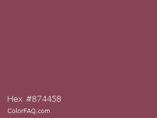 Hex #874458 Color is a normal rose color and the nearest color is Deep Ruby #843f5b. Hex code #874458 and RGB value is rgb(135,68,88). In RGB color space, this color is composed of 53% red, 27% green, 35% blue, In CMYK color space, this color is composed of 0% cyan, 50% magenta, 35% yellow , 47% black , In HSL color space, this color has a hue angle of 342° , 33% saturation and 40% lightness.